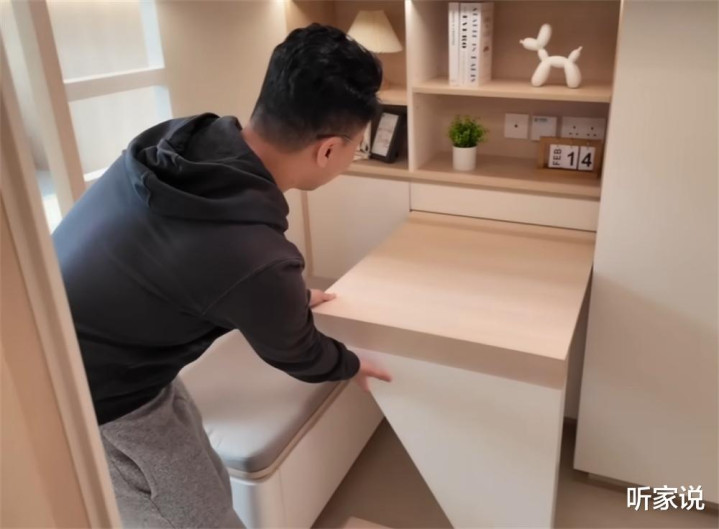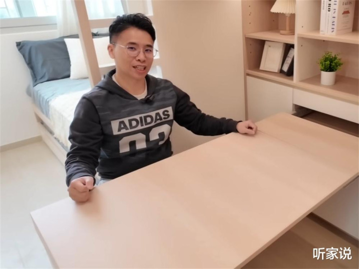平日里,就是一张书桌的状态,既不会占用来回的过道动线,又够两个孩子写作业和学习,虽说是紧凑了点,但毕竟家里只有17㎡,能坐得下已是实属不易。