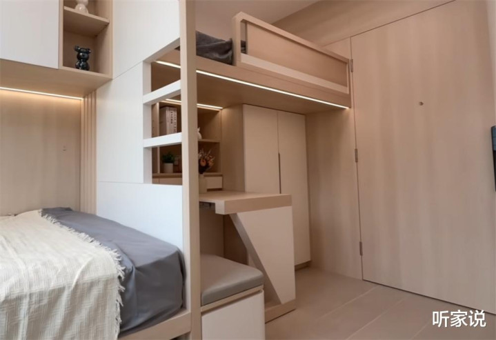 实话说,我是真没想到一间17㎡的小空间内,居然能塞下三张床,真的是“上天入地”无所不用其极!这空间利用之充分也真是让人感到佩服。
