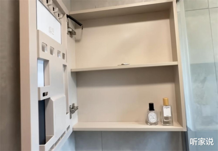 还有镜柜,一家四口的洗漱清洁和沐浴用品都能塞在里面,弥补了台面空间不足的先天缺陷,至于牙刷等其他物品,就等入住后用墙面架来收纳了。