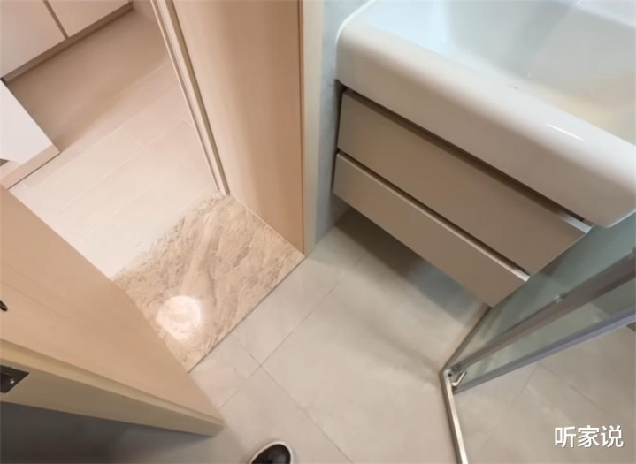 洗手池放在了一进门的位置,底部做两个抽屉柜当收纳空间,上面是个一体式的陶瓷台盆,别说,用起来还挺顺手的,但入住后这一家四口洗漱如厕怎么才能不排队,或许是个大问题……