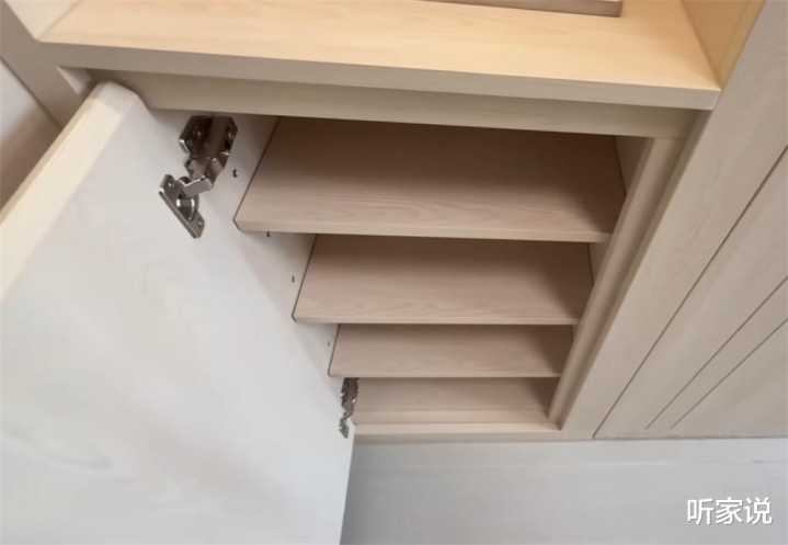 左手边,则是玄关柜和鞋柜的组合,四层鞋柜,最多也只能放下8—12双鞋子,如果不坚持断舍离和少物的状态,这17㎡的小家还真挺难住下这一家四口人的……