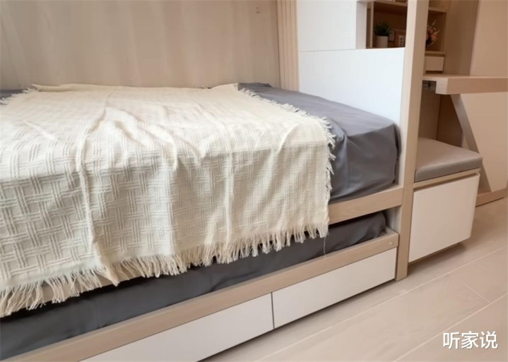比起传统箱体床的设计,这张双人床底部的箱体变成了一张小床,将床垫架从床底抽出来后,就拥有了另外一张小床,且相对于其他的折叠家具来说,只需要一抽一拉的设计要方便不少。
