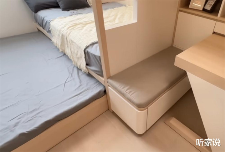 上铺是一张狭窄的单人床,出于安全考虑做了一道矮护栏,护栏一侧几乎贴上了家里的房门,但因为有木质饰面,看起来也能与家里的装修风格相融,不会觉得睡在门口很没安全感。