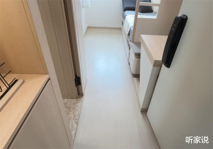 原先开间的2/3空间,现在都被柜子占据,只留出一条窄窄的过道通向室内,右手边的柜子其实就是家里的全部床位,我们放到后面再说。