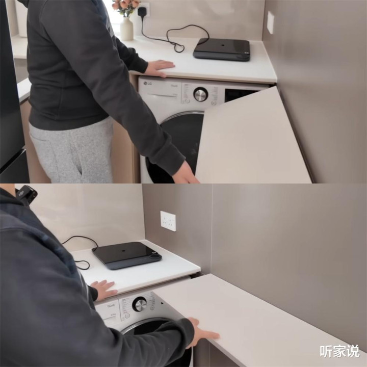 厨房内还有个比较有趣的小设计——折叠板,展开后,厨房变成了U形格局,既是做饭时放盘子碗碟的延伸台面,又是在用洗衣机后,叠衣晾晒的洗衣间台面,不用的时候收起来,完全不占地儿。